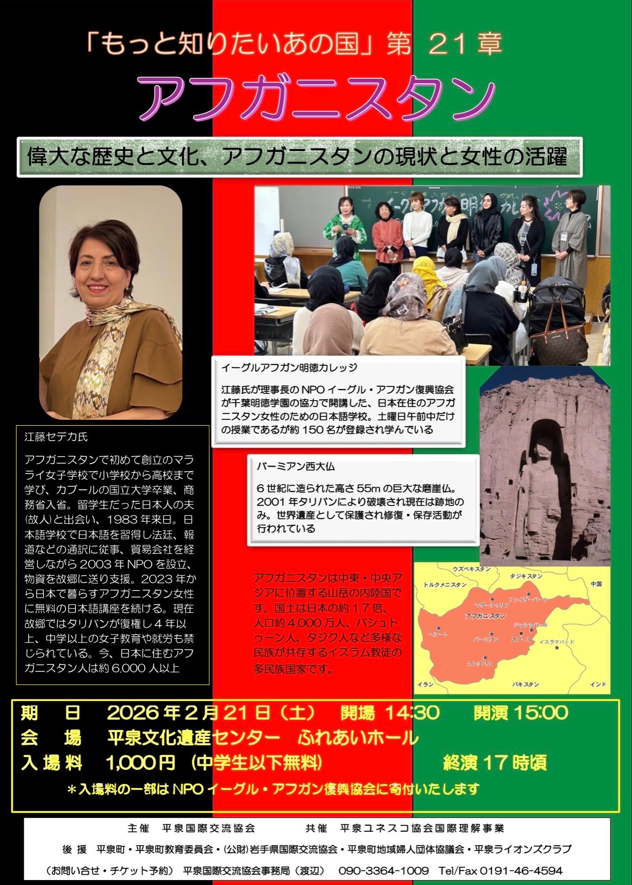 江藤セデカ イーグル・アフガン復興協会理事長、岩手県・平泉で講演 2月21日(土)